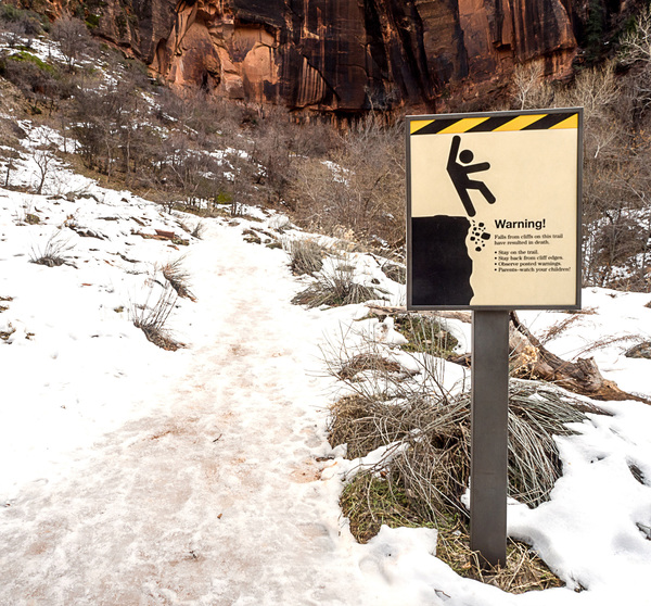 There are warning signs at the trailheads for the more challenging routes. They encourage or warn or recommend that hikers take precautions. For example, the trailhead signs at Angels Landing (a harrowing hike known to turn grown men into terrified puddles of pudding) reads: "The route is not recommended during high winds, storms, or if snow or ice is present." That is ranger-speak for "DON'T DO IT!"