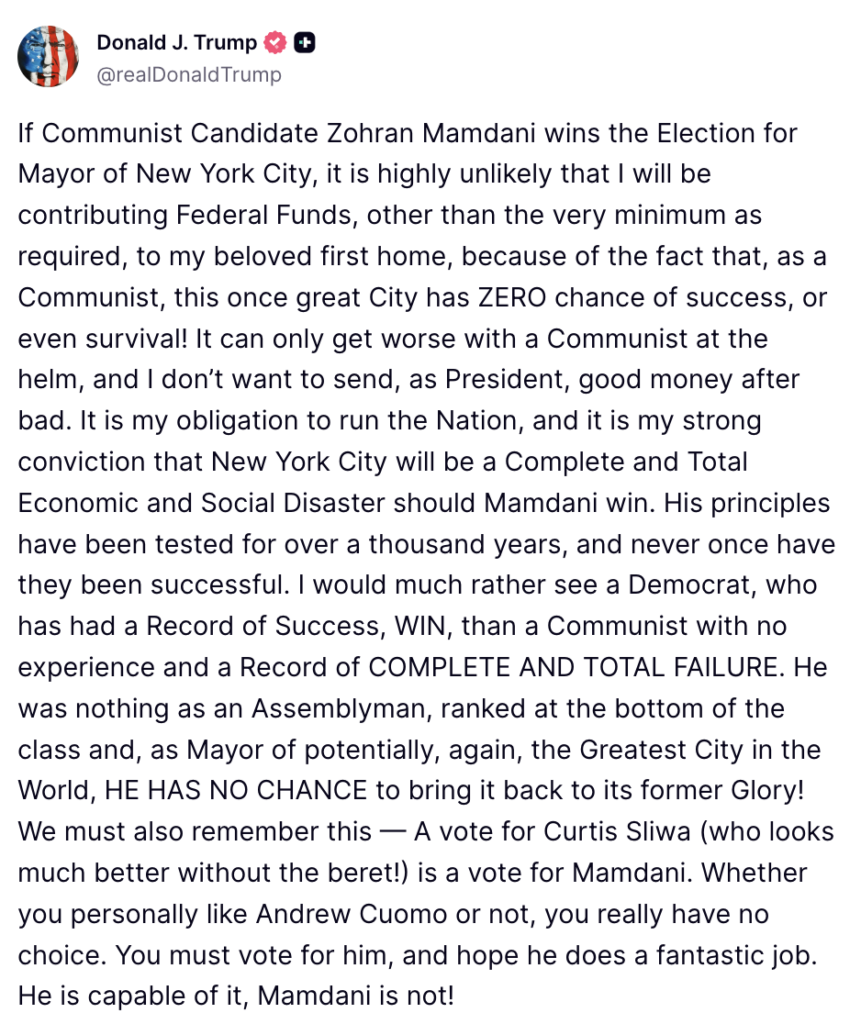 Earlier in the day, Musk urged New Yorkers to vote for Cuomo, who is running an independent campaign against Mamdani, the Democratic nominee and Republican contender Curtis Sliwa (R-N.Y.).