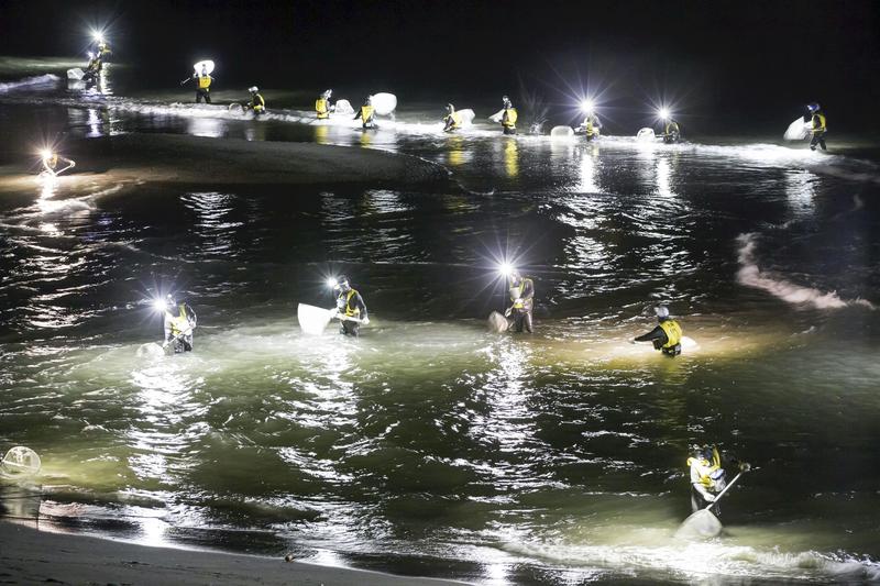 Off a dark coast near the mouth of the Hishidagawa river in Osaki, Kagoshima Prefecture, countless headlamps glittered and fine-mesh fishing nets fluttered above the cold sea shoals. Fishermen waded through waist-deep water as they carefully looked into their nets, only to lower them once more.