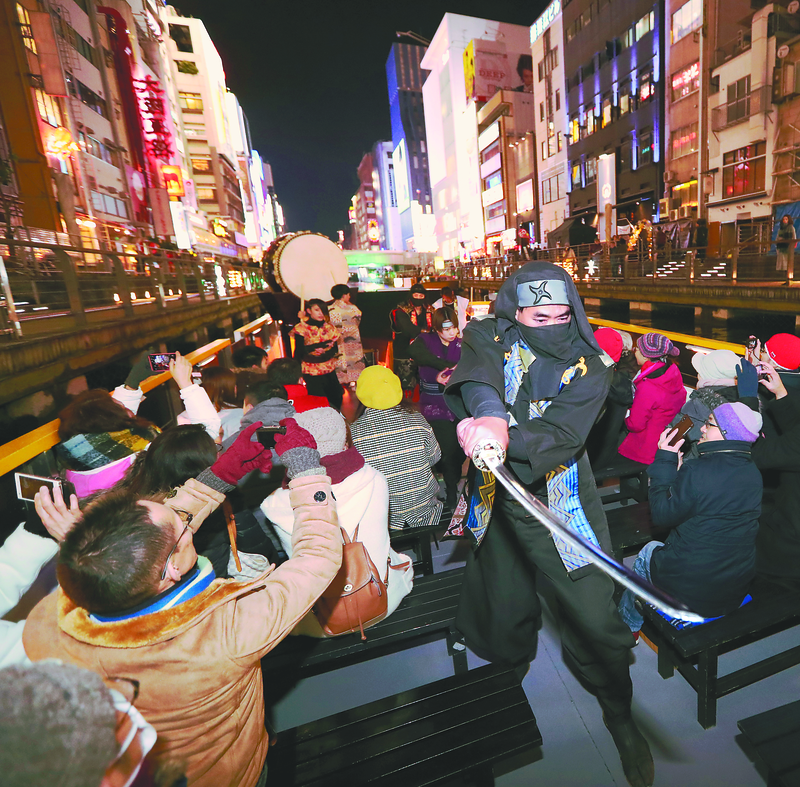 On the evening of Feb. 18 during the Lunar New Year holiday, foreign tourists turned their smartphone cameras toward ninja performers hopping around a boat that was cruising along the Dotonborigawa river in Osaka's Minami district, an entertainment area bustling with foreign visitors. The ninja cruise is known for being a great source of photos for photo-sharing apps such as Instagram.