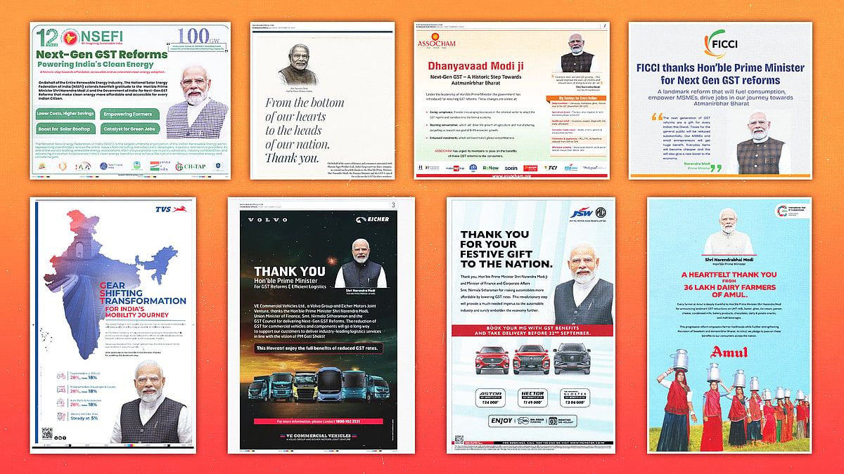 A fortnight after the GST Council announced sweeping rate cuts on essentials and consumer durables, India’s top newspapers were awash with “thank you” notes. Full-page spreads and jackets from companies and trade associations crowded the front and back pages, while several ads carried oversized portraits of Prime Minister Narendra Modi…
