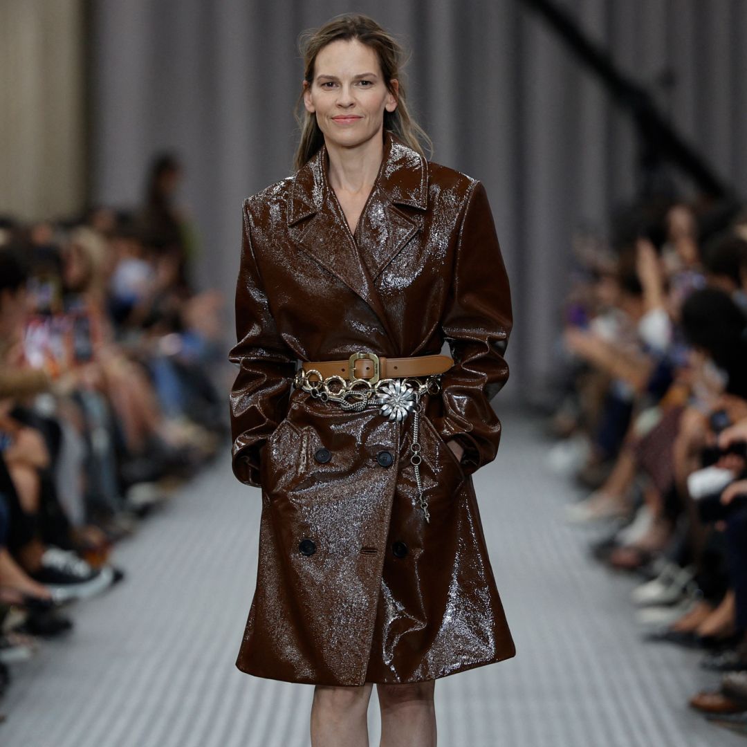 Hilary Swank's Surprise Miu Miu Runway Walk at Paris Fashion Week Features a Triple-Belted Trench Coat and Almost No Makeup