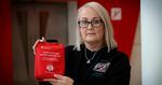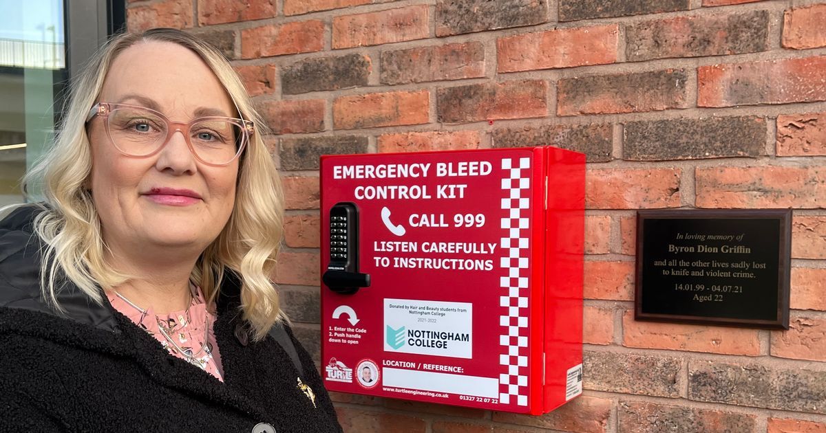 Zoe Cooke has given a heartfelt speech outside Nottingham College on Canal Street where a new anti-bleed kit cabinet was installed on the wall - along with a plaque dedicated to the memory of her son Byron Griffin.