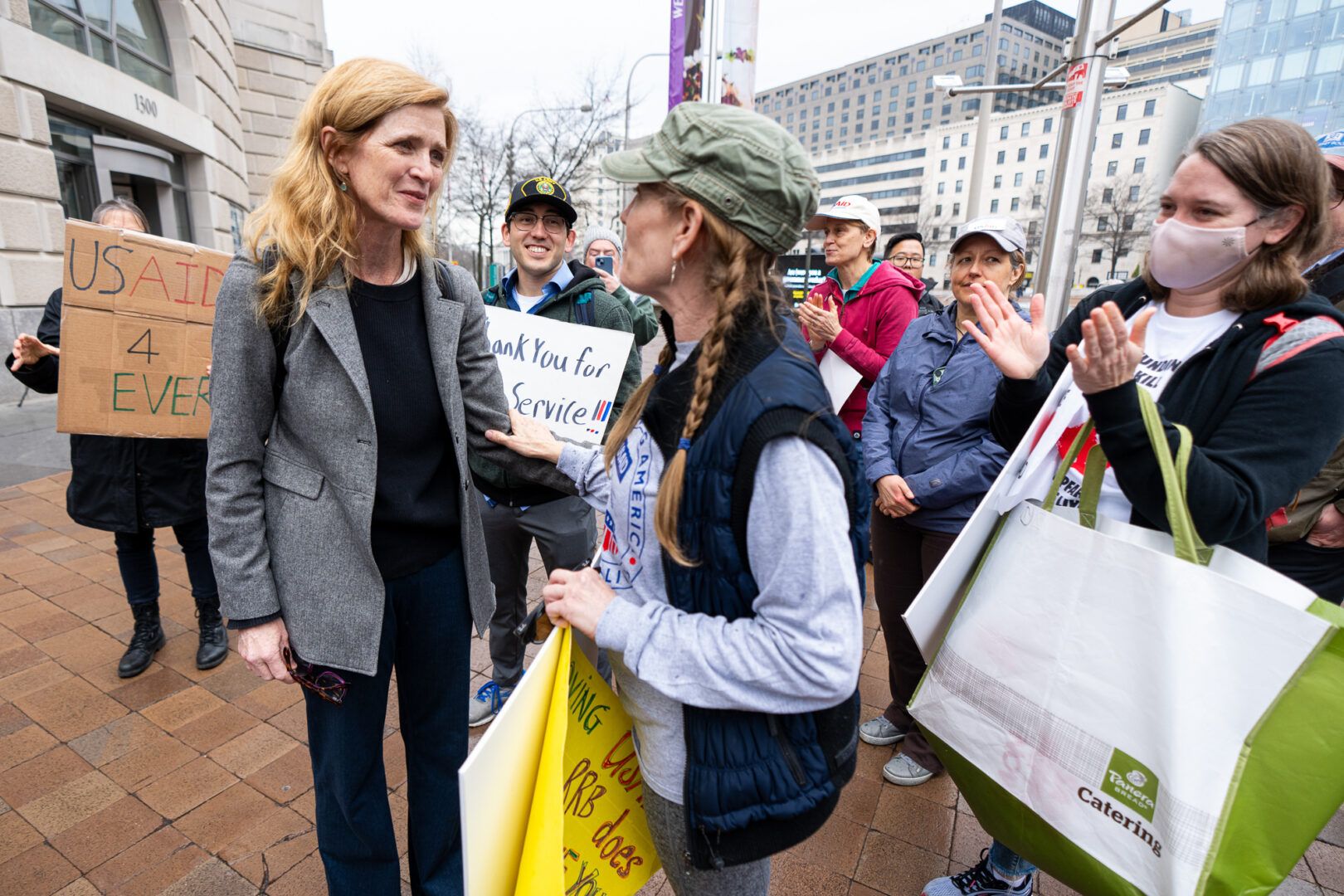 Former USAID Administrator Samantha Power greets and comforts recently fired employees on Thursday outside of the agency’s now-closed office.