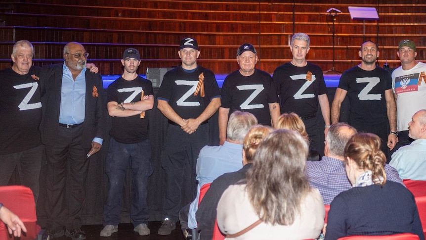 Several men wearing shirts with the letter Z — a symbol representing support for Russian President Vladimir Putin's invasion of Ukraine — gathered at the front of Sydney Town Hall following a performance of the Russian Orthodox Male Choir.